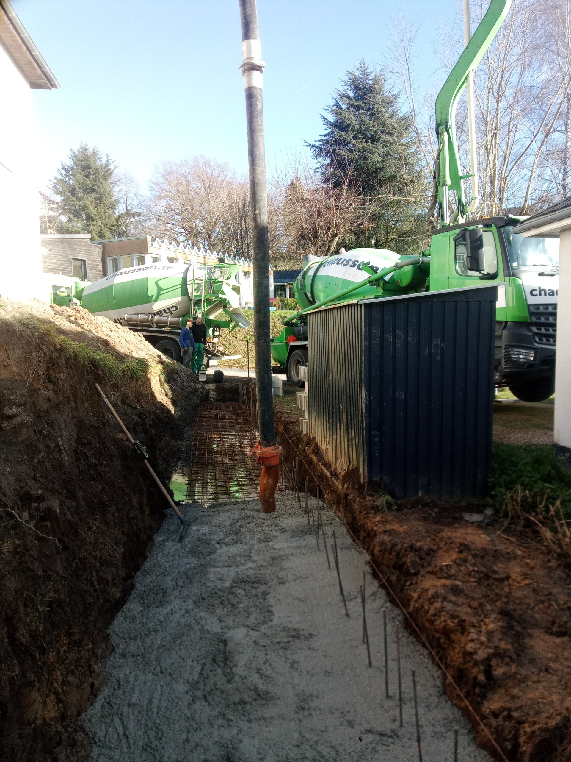 Réalisation d'une dalle en béton pour terrasse, coulage avec camion toupie