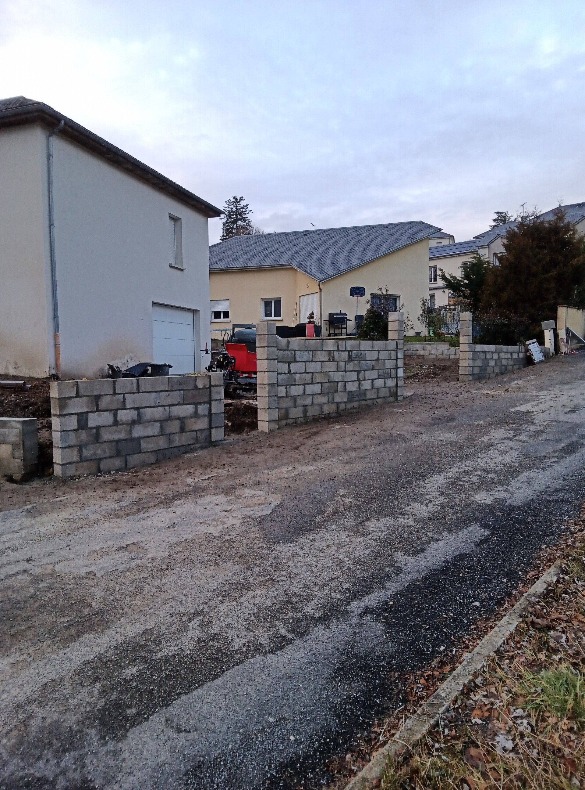 Travaux de nivellement de terrain, suivis de la construction d'un muret en blocs à bancher, et enfin, la réalisation d'une dalle en béton